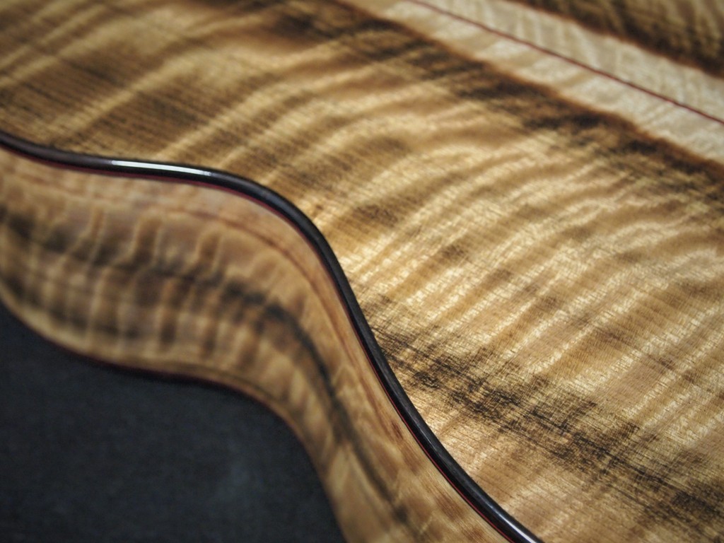 First look--big baritone with a PNW theme: highly First look--big baritone with a PNW theme:  highly figured big leaf maple body, Alaskan "bearclaw" spruce sound board and micro curl claro walnut binding and accents.