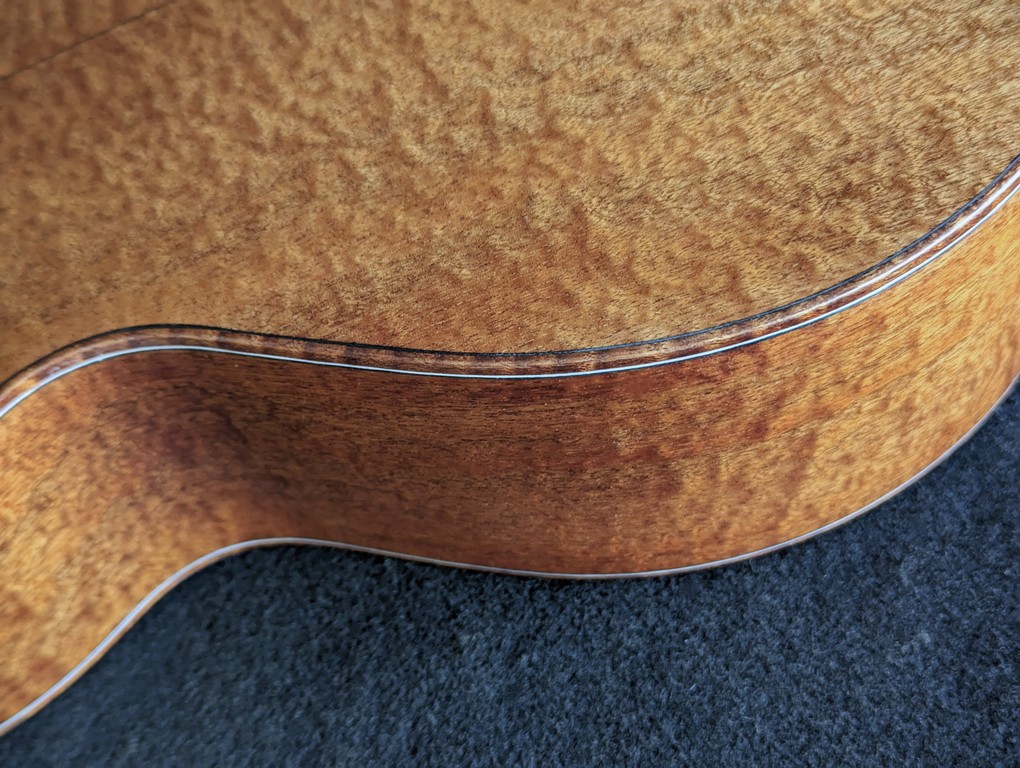 First look-- new big baritone with some striking c First look-- new big baritone with some striking claro walnut @marvelwoods ,  a brownish dark forest cypress top @dark_forest_cypress , and some curly maple for binding.