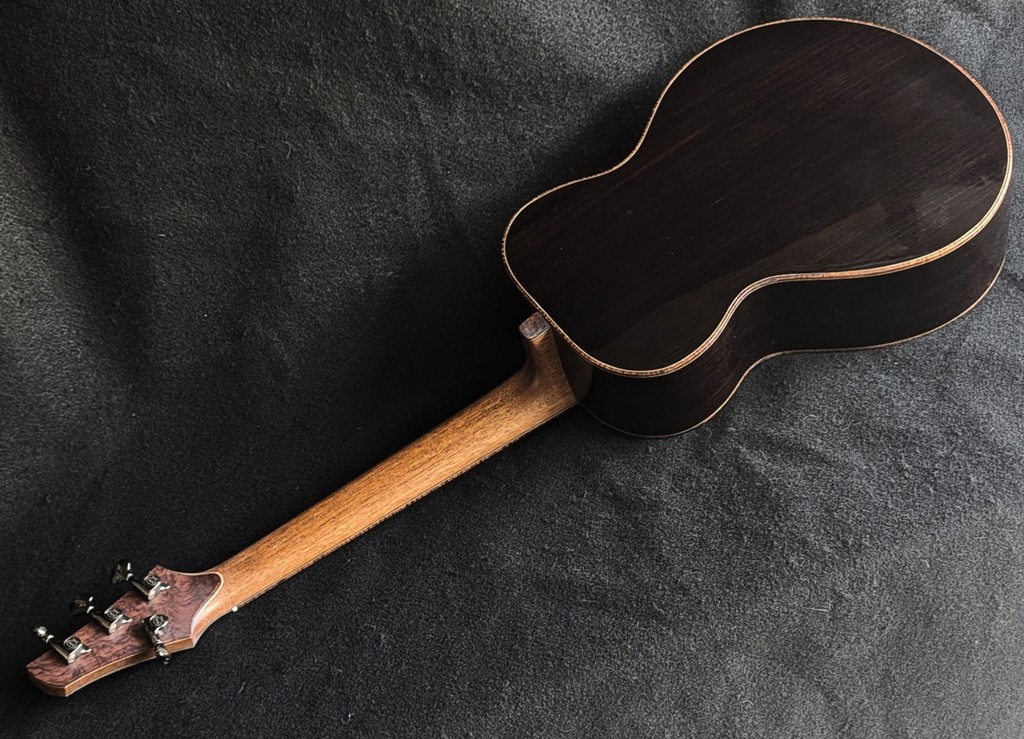 Body: It really is all about the woods. I wanted a more traditional looking instrument with traditional woods. So, here’s some classic, old growth, India Rosewood. It looks almost like old growth Brazilian. It is one of the most notorious acoustic woods ever.